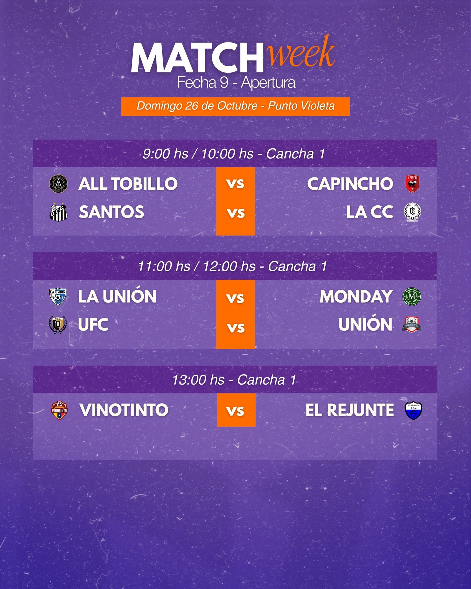 🏟 Complejo @puntovioleta.oficial 📅 Domingo 26/10 🎟 Entradas: $20 / Jugadores y cuerpo técnico: 𝐆𝐫𝐚𝐭𝐢𝐬 ¡Seguimos a puro fútbol! ⚽🔥